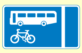 Buses and cycles can travel in this lane. In this example, they'll flow in the same direction as other traffic. If it's busy, they may be passing you on the left, so watch out for them. Times on the sign will show the lane's hours of operation; if no times are shown, or there's no sign at all, this means the lane is in operation 24 hours a day. In some areas, other vehicles, such as taxis and motorcycles, are allowed to use bus lanes. The sign will show if this is the case.